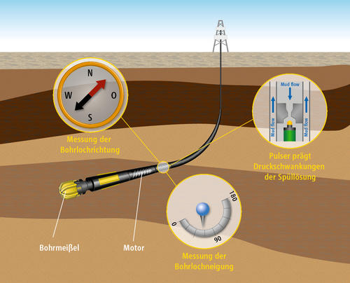 Klar ist, dass der Richtbohrer, der die Bohrung auf das vorgegebene Ziel lenkt, über die Neigung und Himmelsrichtung, in die er gerade bohrt, stets im Bilde sein muss. Die mit dem „Measurement While Drilling“-System (MWD) erhobenen Messdaten gelangen über die Bohrspülung zum Richtbohrer. Das funktioniert folgendermaßen: Ein im MWD untergebrachtes Ventil – gesteuert über einen Mini-Computer in der Tiefe – erzeugt durch Öffnen und Schließen so genannte Druckpulse über den Spülungsstrom im Inneren des Bohrstrangs. Ein Drucksensor am oberen Ende des Stranges nimmt die Druckpulse auf, die von einem Computer ausgewertet und in eine digitale Anzeige übersetzt werden. Auf die können unsere Bohrtechniker dann reagieren.