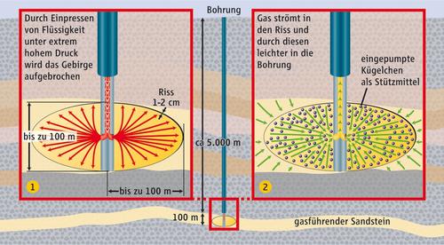 Erdgas befindet sich tief unter der Erdoberfläche in den Poren der Lagerstätten. Um den Zufluss aus der Lagerstätte zu erhöhen, werden Bohrungen hydraulisch stimuliert.