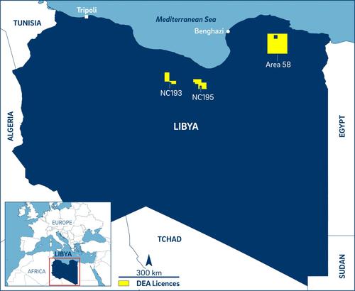 DEA is operator of three concessions in the country, with a share of 100%. The total concession area has a size of 14,235 square kilometres. Two of the licences are in the Sirte Basin (NC 193 and NC 195), while one concession on the Cyrenaica platform (Area 58) is located in the northeast of the country.