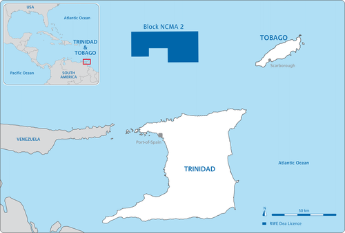 As part of the 2010 bidding round for shallow water blocks in Trinidad and Tobago, DEA was awarded the NCMA2 block. The NCMA2 block has an area of 1,019 square kilometres and is around 50 kilometres off the northern coast of Trinidad and Tobago in water depths between 100 and 200 metres. It lies on the same structural trend as the major gas fields Hibiscus and Chaconia.
